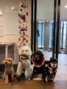 特別養護老人ホーム 雪のほこら さまでの活動でした! メンバーは、ひばり・りんたろう・雅・クリスの4頭です♪ もうすぐクリスマスということでワンコたちもクリスマスの装い☺︎ 雪のほこらさま、今回もありがとうございました!